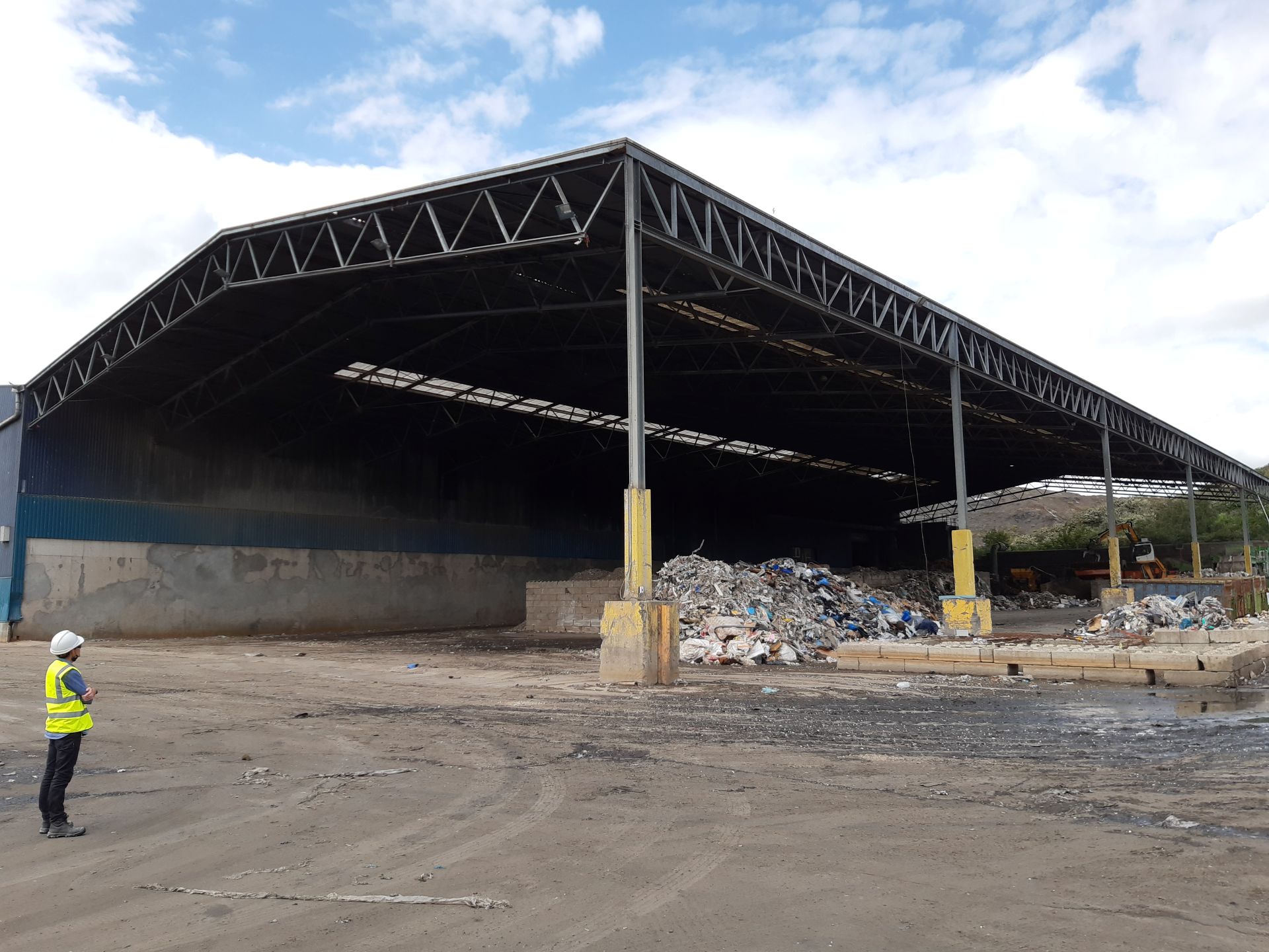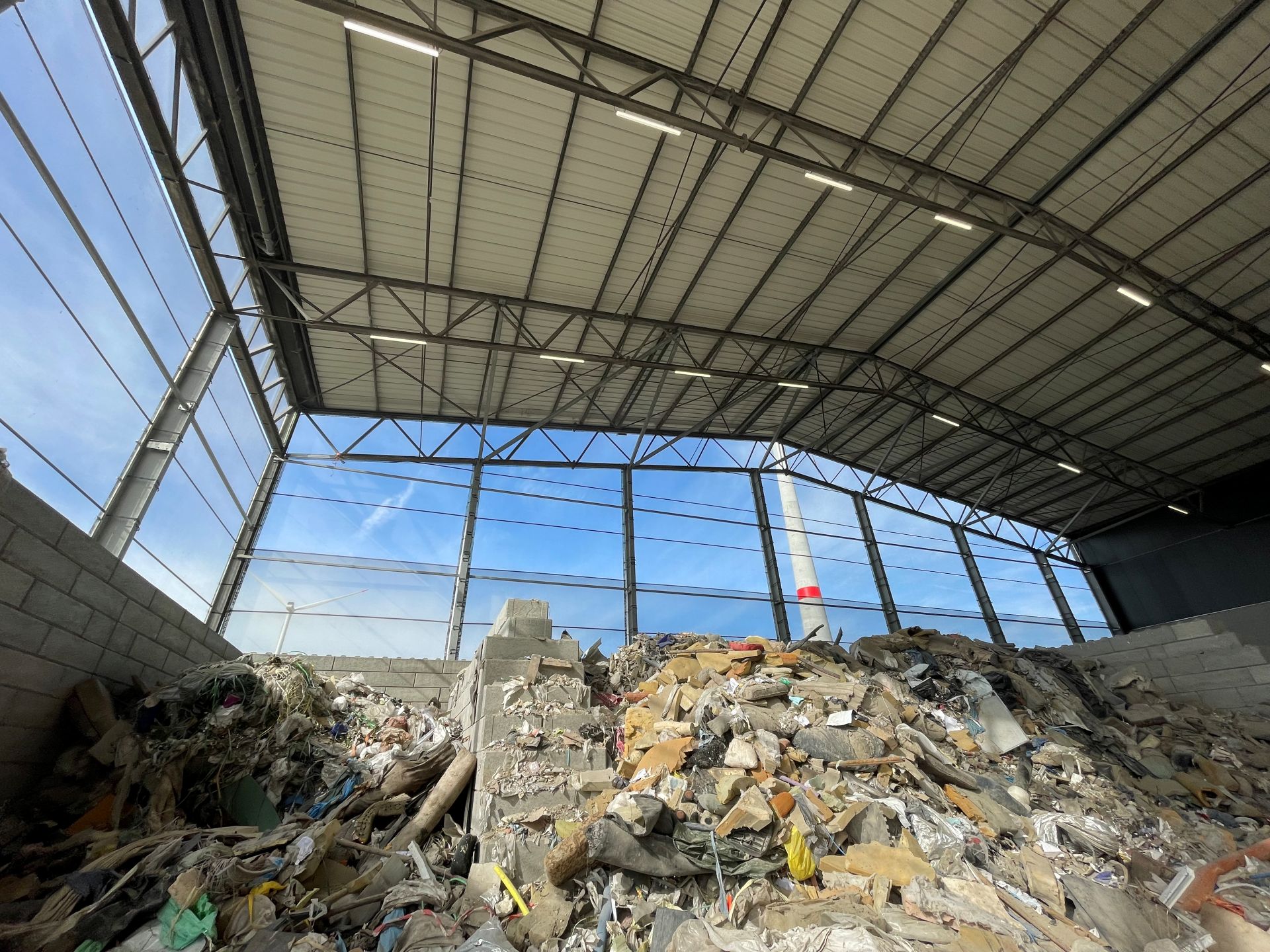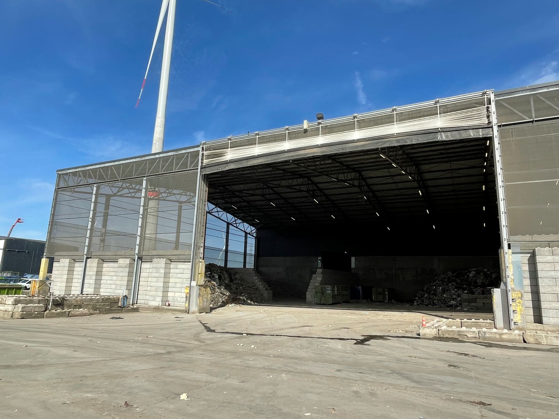 Deze bestaande recyclage luifel werd volledig getransformeerd van een open structuur naar een geventileerde en conforme luifelconstructie. Het project omvatte de volledige engineering, structurele aanpassingen en versteviging van de bestaande staalconstructie, zodat nieuwe schermen en industriële poorten veilig konden worden geïnstalleerd. De buitenzijde werd afgewerkt met vaste stofschermen. Deze schermen zorgen voor windbreking, natuurlijke ventilatie en effectieve stofbeheersing, terwijl ze tegelijk de verspreiding van stof naar de omgeving beperken. Daarnaast werden de twee grote poortopeningen van 20 meter breed en 13 meter hoog uitgerust met mammoetpoorten, geschikt voor intensief industrieel gebruik en grote doorgangen voor vrachtverkeer. Dankzij deze ingrepen is de luifel nu volledig conform de geldende regelgeving en draagt de constructie actief bij aan efficiënte stofopvang en een betere werkomgeving.