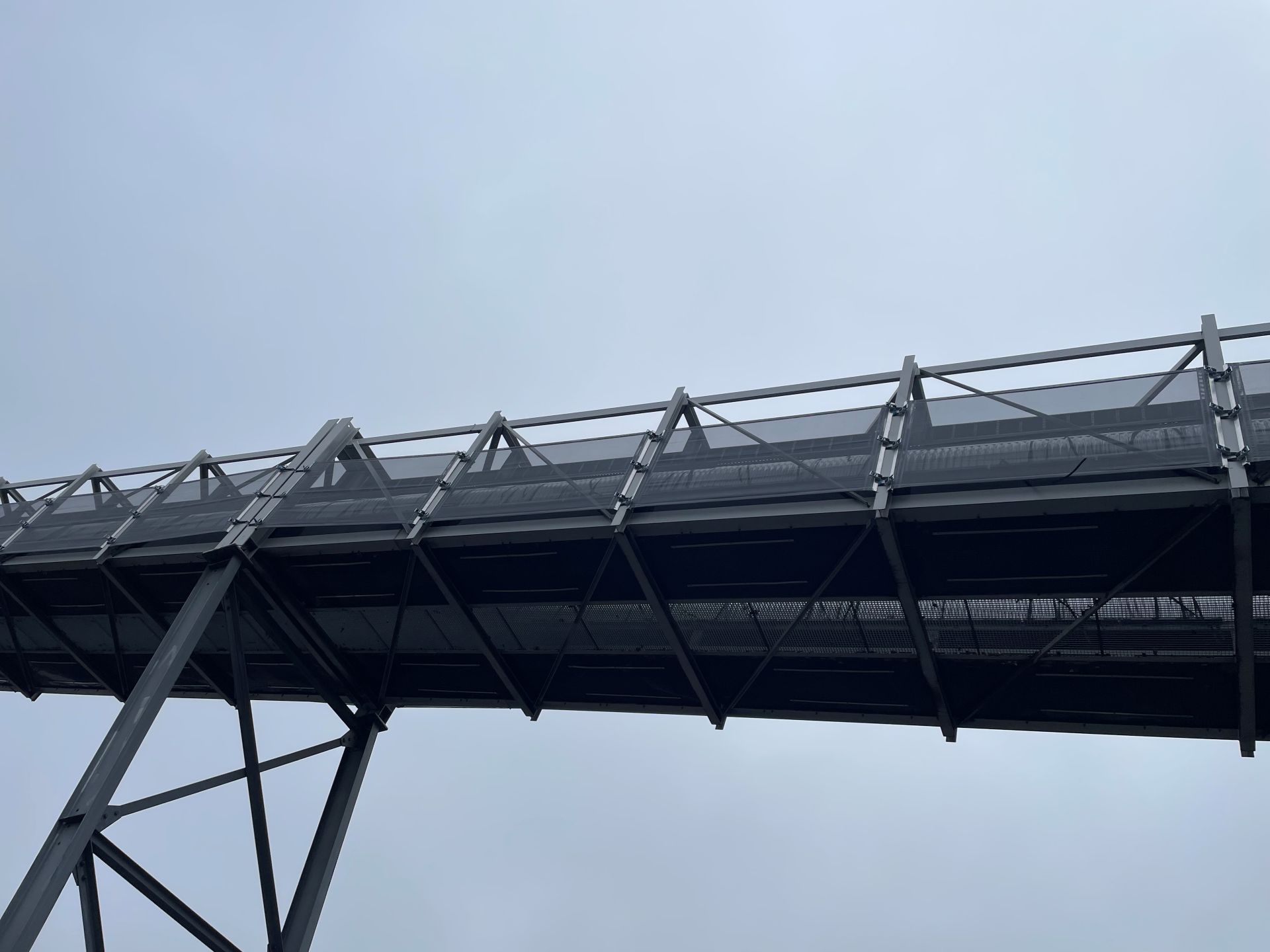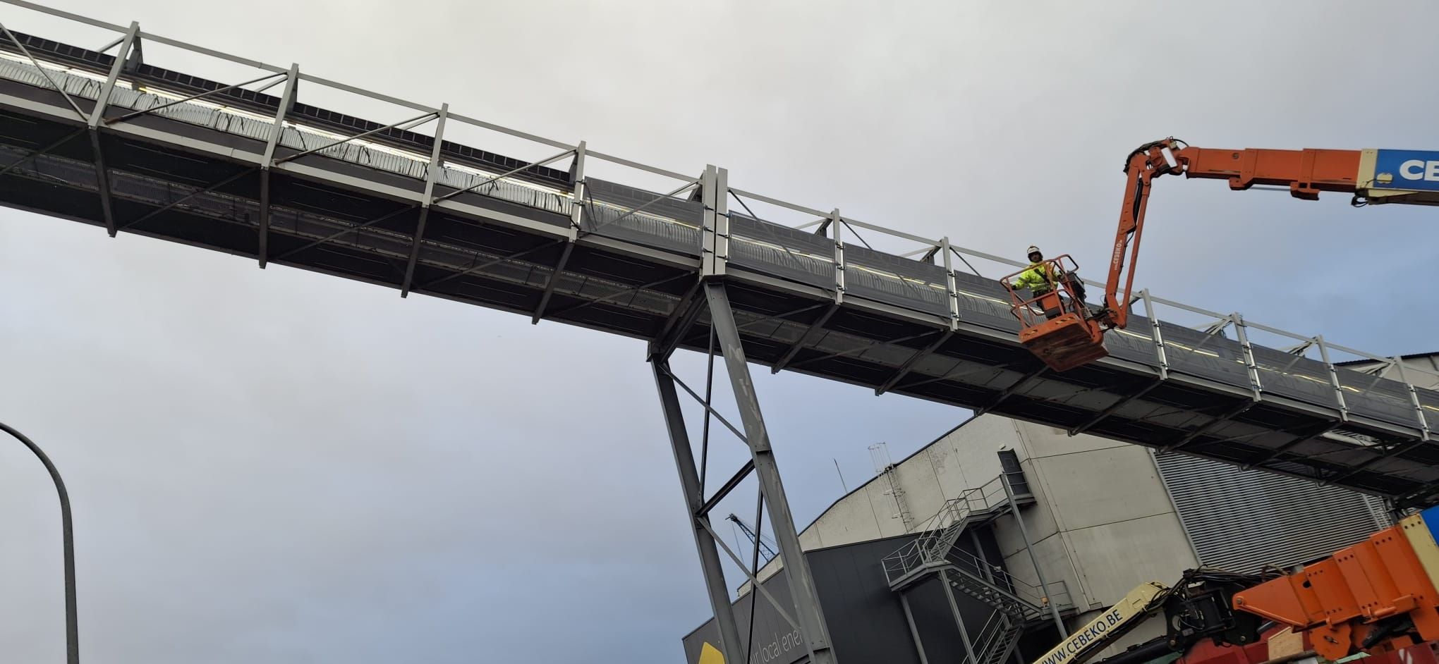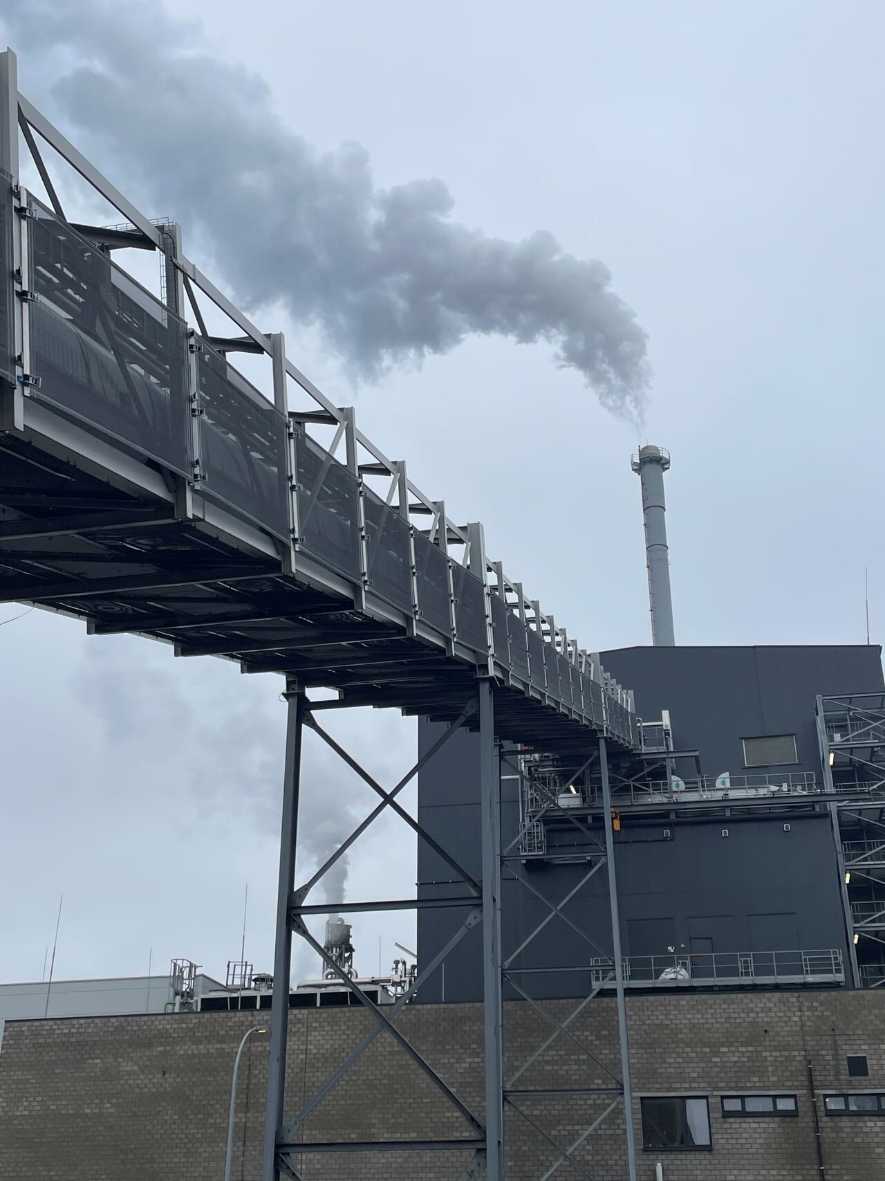 Voor deze bio-energiecentrale werden stofschermen geplaatst rond een 40 meter hoge transportband om stofverspreiding te beperken en de installatie te beschermen tegen windinvloeden. 🌬️♻️